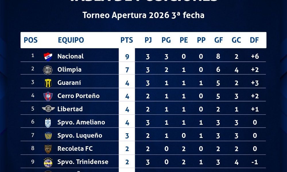 Tras completarse la Fecha 3 (finales de enero / inicios de febrero 2026), Nacional Asunción se consolida como líder absoluto con puntaje ideal (9 pts, 3 victorias, +6). Cerro Porteño y Olimpia lo escoltan con 7 puntos y siguen invictos, marcando una pelea de alto nivel entre los grandes. La Fecha 3 dejó victorias importantes de los punteros y tropiezos que empiezan a marcar distancias en la parte baja.